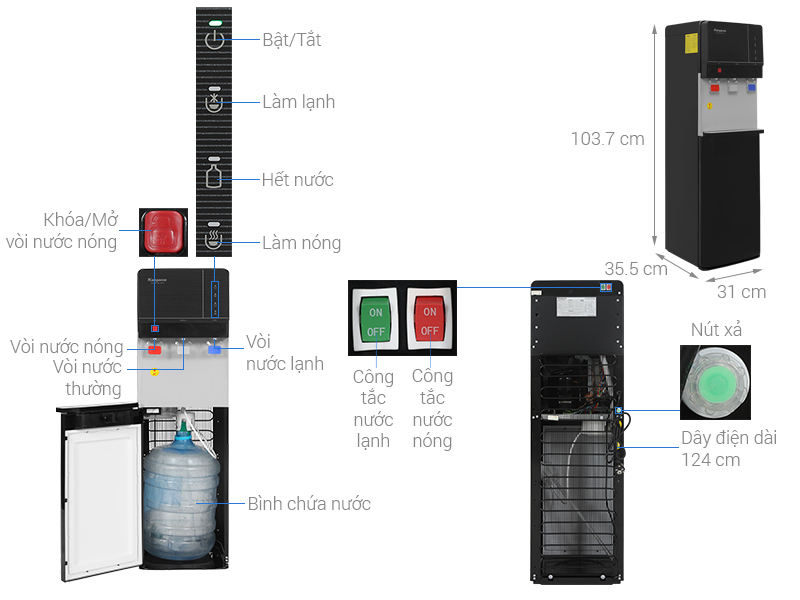 – Cung cấp 3 chế độ nước: nóng – nguội – lạnh đáp ứng nhiều nhu cầu sử dụng.