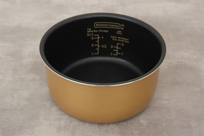 – Lòng nồi cấu tạo 5 lớp với nhôm là chất liệu chính, có độ dày 2.4 mm bền tốt. Bên trong lòng nồi phủ lớp Binchotan chống dính cao cấp giúp truyền nhiệt hiệu quả và dễ vệ sinh.