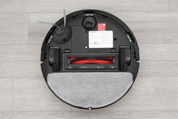 Mặt dưới bố trí chổi chính bằng cao su hạn chế rối tóc, chổi cạnh gom bụi dọc tường, bánh xe đàn hồi có thể vượt bậc thấp, cùng khay gắn giẻ lau tiện tháo lắp. Các cảm biến chống rơi được đặt quanh viền đáy, giúp robot an toàn khi di chuyển gần cầu thang hoặc mép sàn.